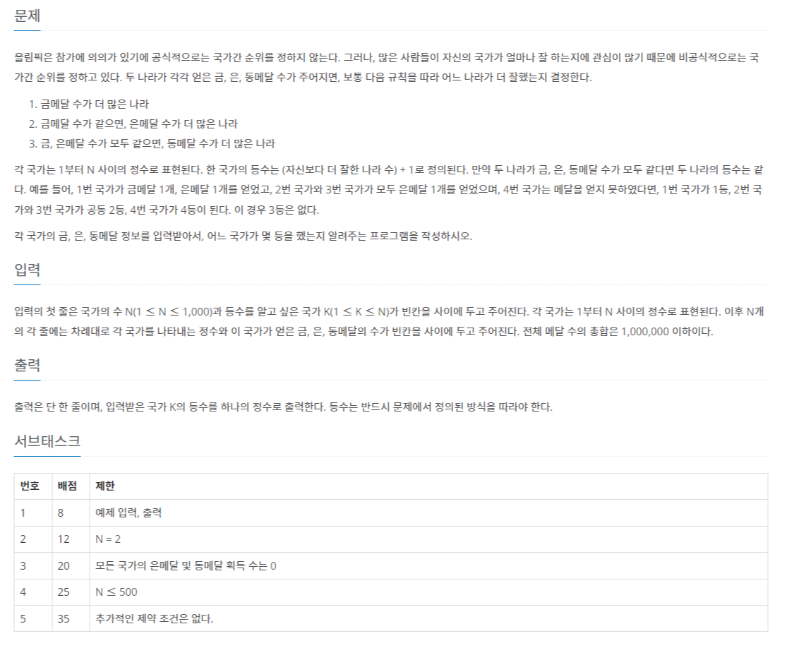 입력의 첫 줄은 국가의 수 N(1 ≤ N ≤ 1,000)과 등수를 알고 싶은 국가 K(1 ≤ K ≤ N)가 빈칸을 사이에 두고 주어진다. 각 국가는 1부터 N 사이의 정수로 표현된다. 이후 N개의 각 줄에는 차례대로 각