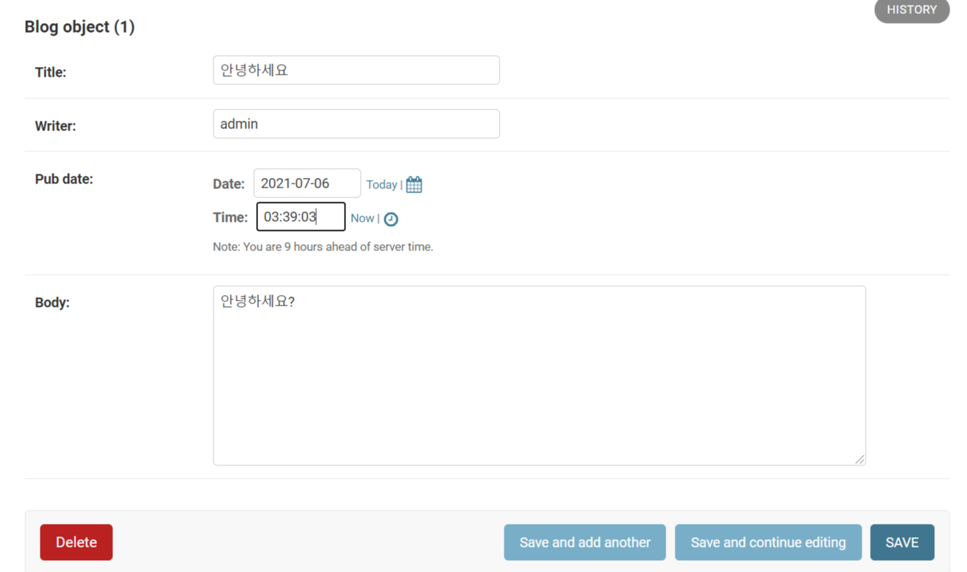 시간 수정 => settings.py TIME_ZONE = 'Asia/Seoul'