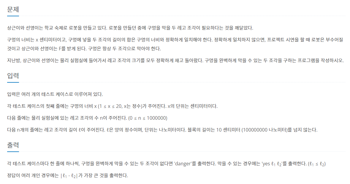 각 테스트 케이스마다 한 줄에 하나씩, 구멍을 완벽하게 막을 수 있는 두 조각이 없다면 'danger'를 출력한다. 막을 수 있는 경우에는 'yes ℓ1 ℓ2'를 출력한다. (ℓ1 ≤ ℓ2) 정답이 여러 개인 경우에