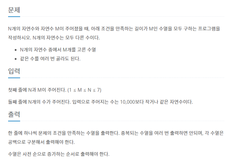 N개의 자연수와 자연수 M이 주어졌을 때, 아래 조건을 만족하는 길이가 M인 수열을 모두 구하는 프로그램을 작성하시오. N개의 자연수는 모두 다른 수이다. N개의 자연수 중에서 M개를 고른 수열