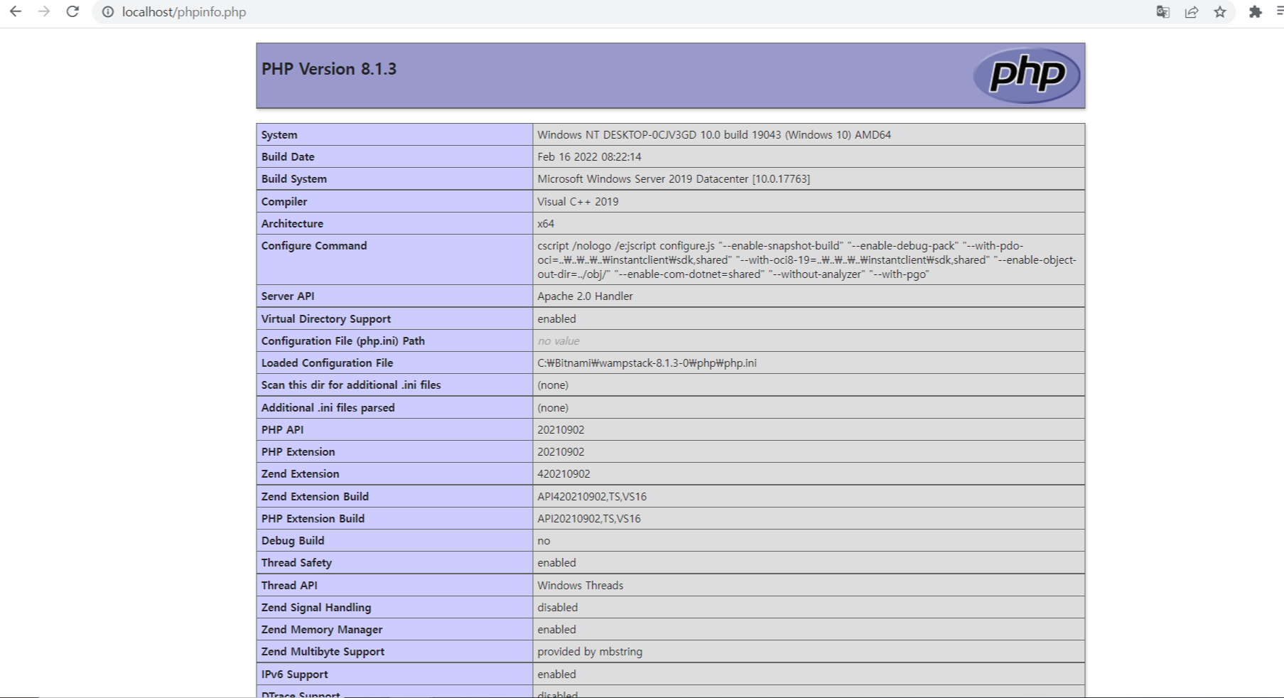 localhost:[포트번호]/phpinfo.php 를 열면 php version 화면이 나옴.