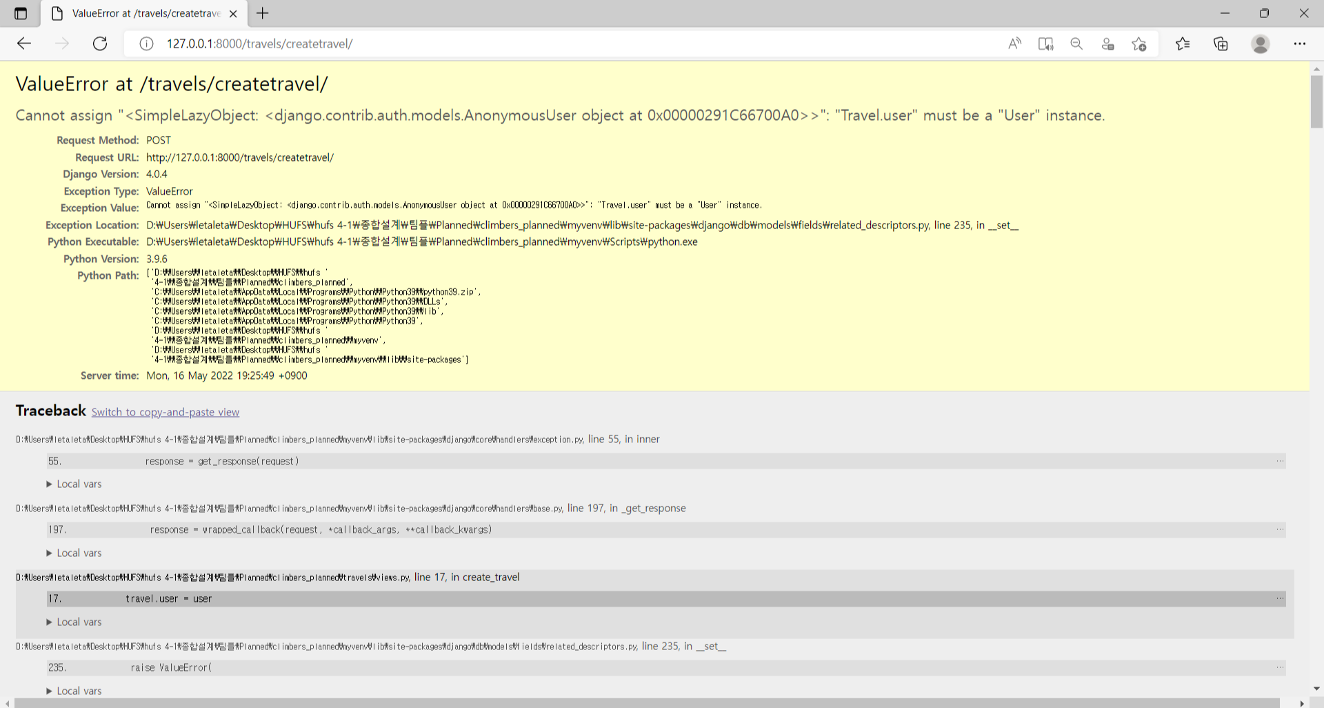 서버 잘 돌아가는 거 확인하고 commit, merge 했는데 다시 돌려보니까 여행지 추가 페이지에서 폼 작성하고 경로 확인 페이지로 넘어갈 때 아래의 에러가 난다.