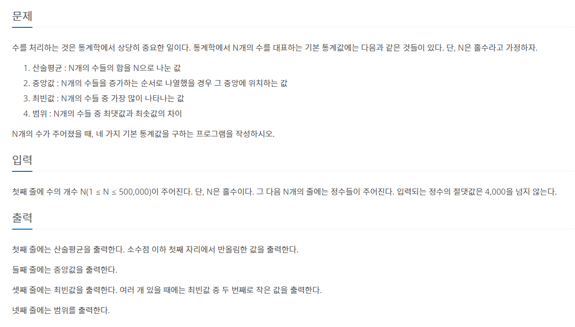 첫째 줄에 수의 개수 N(1 ≤ N ≤ 500,000)이 주어진다. 단, N은 홀수이다. 그 다음 N개의 줄에는 정수들이 주어진다. 입력되는 정수의 절댓값은 4,000을 넘지 않는다.