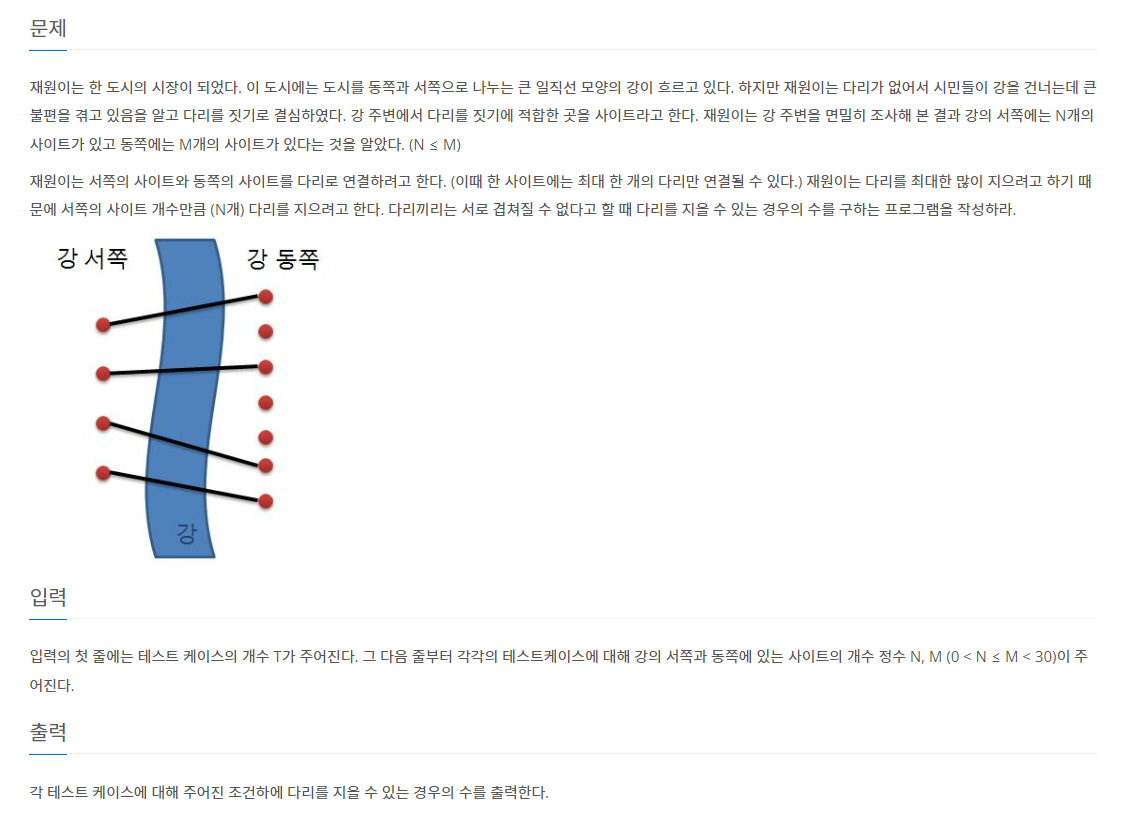 i == j인 경우 다리 놓는 방법이 1가지이므로 해당 조건을 추가해주었다.