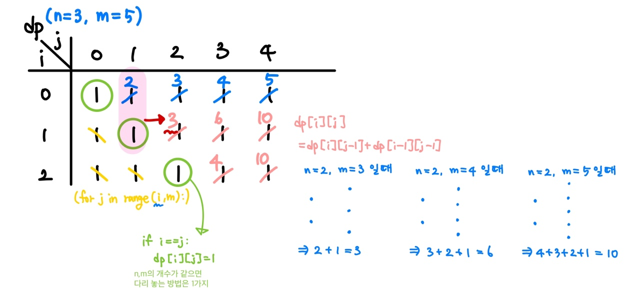 문제 https://www.acmicpc.net/problem/1010 1010번: 다리 놓기 입력의 첫 줄에는 테스트 케이스의 개수 T가 주어진다. 그 다음 줄부터 각각의 테스트케이스에 대해 강의 서쪽과 동쪽에 있는 사이트의 개수