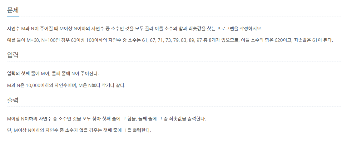 M이상 N이하의 자연수 중 소수인 것을 모두 찾아 첫째 줄에 그 합을, 둘째 줄에 그 중 최솟값을 출력한다. 단, M이상 N이하의 자연수 중 소수가 없을 경우는 첫째 줄에 -1을 출력한다.