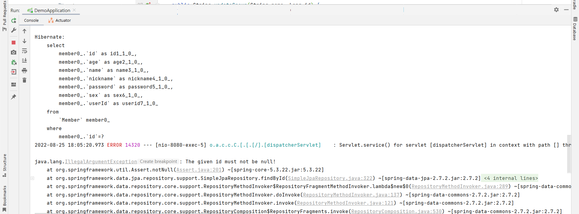 Servlet.service() for servlet [dispatcherServlet] in context with path [] threw exception [Request processing failed; nested exception is org.springframework.dao.InvalidDataAccessApiUsageException: The given id must not be null!; nested exception is java.lang.IllegalArgumentException: The given id must not be null!] with root cause