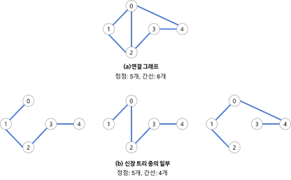 하나의 그래프에는 여러 개의 신장 트리가 존재 가능.