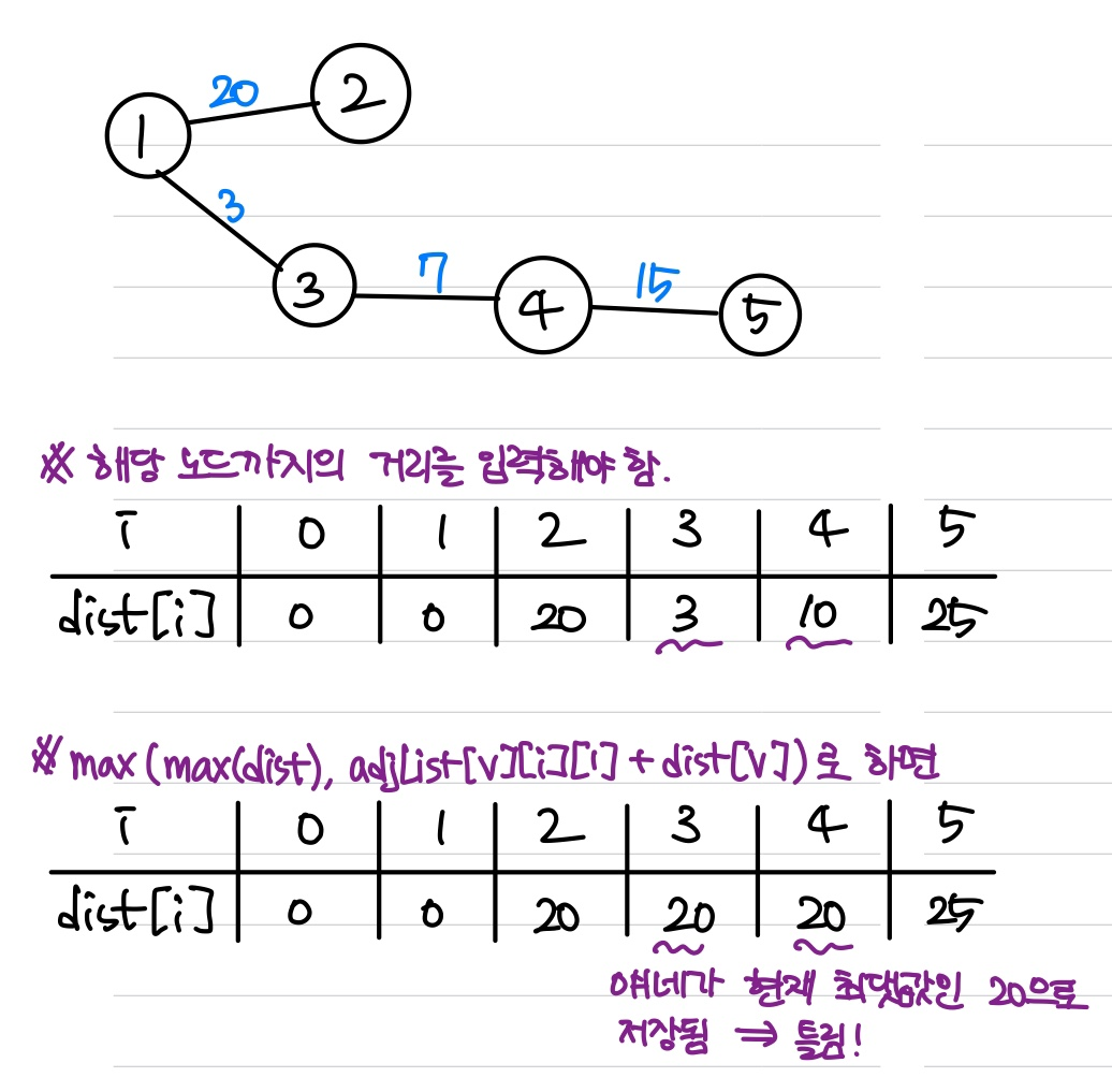 dist[w] = max(max(dist), adjList[v][i][1] + dist[v]) 이렇게 저장을 하면 현재 최댓값보다 최댓값이 나오기 전까지의 값들이 전부 현재 최댓값으로 저장이 된다.