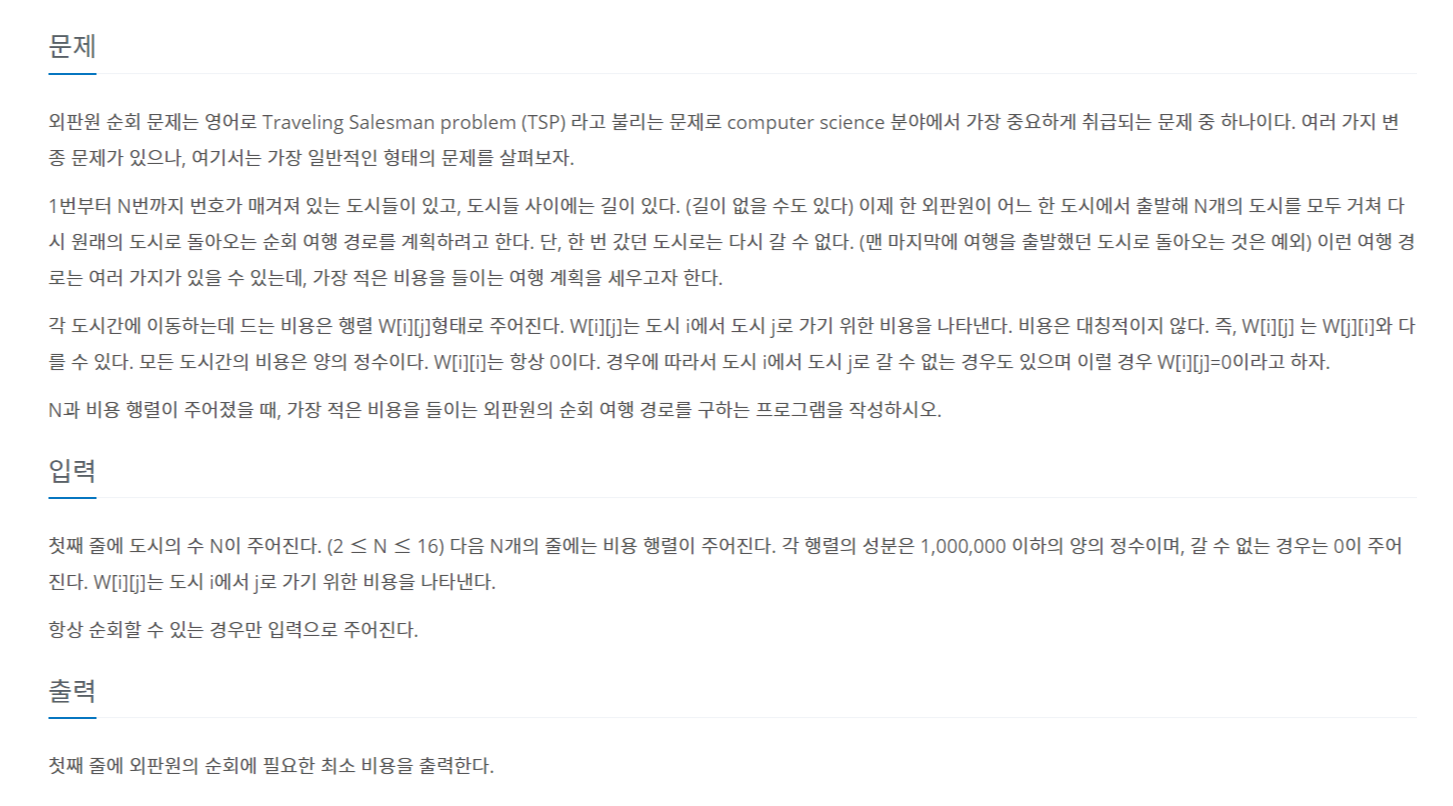 <백준 2098 - 외판원 순회> https://www.acmicpc.net/problem/2098