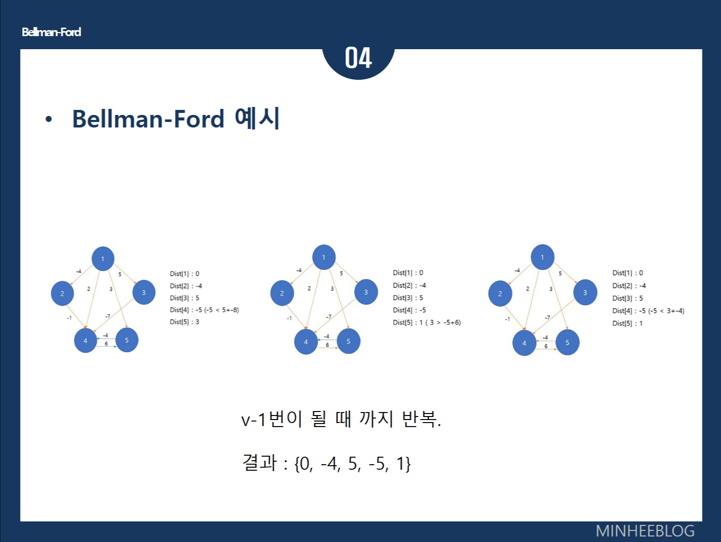 - 음수 가중치가 있는 그래프의 시작 정점에서 다른 정점까지의 최단 거리를 구할 수 있다.