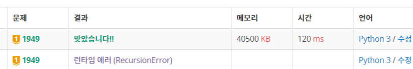 제출하고 나서 recursion error 나서 당황했는데 sys.recursionlimit(10**6) 넣어주니까 바로 풀렸다 !!