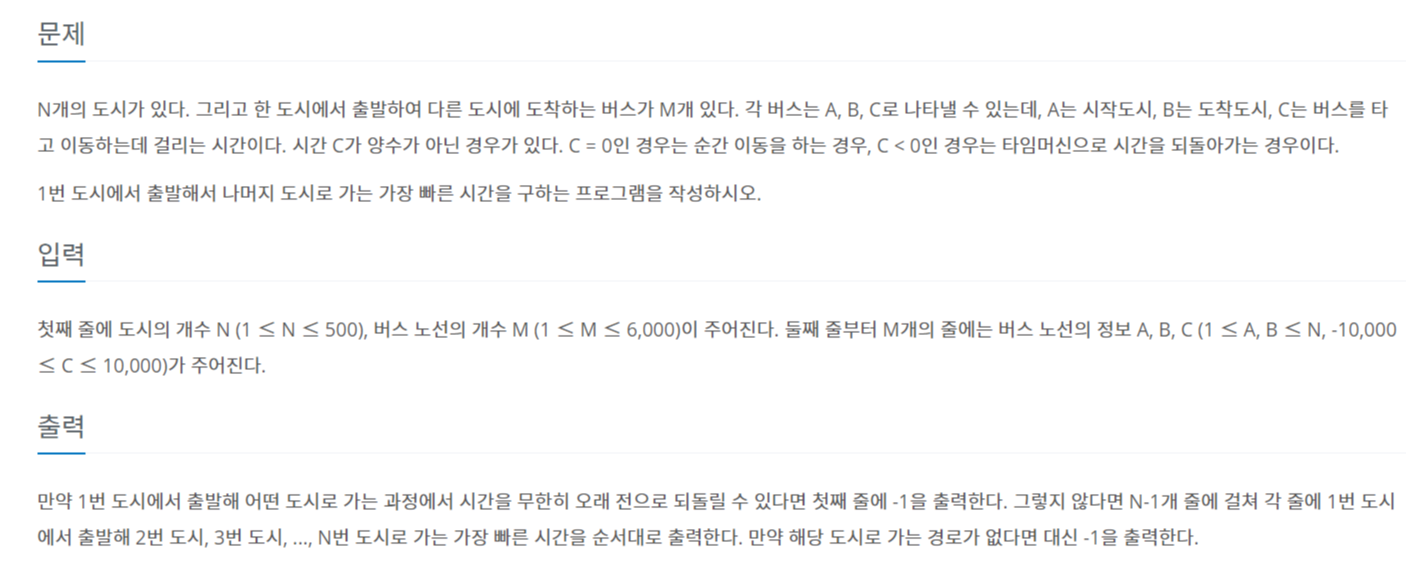첫째 줄에 도시의 개수 N (1 ≤ N ≤ 500), 버스 노선의 개수 M (1 ≤ M ≤ 6,000)이 주어진다. 둘째 줄부터 M개의 줄에는 버스 노선의 정보 A, B, C (1 ≤ A, B ≤ N, -10,000 ≤ C ≤ 10,000)가 주어진다.