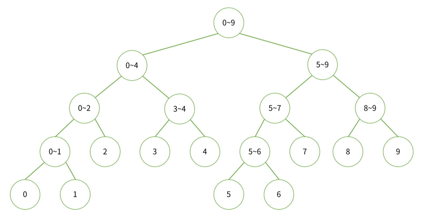 세그먼트 트리를 이루는 각 노드의 왼쪽 자식과 오른쪽 자식이 각각 해당 구간의 왼쪽 반과 오른쪽 반을 표현.