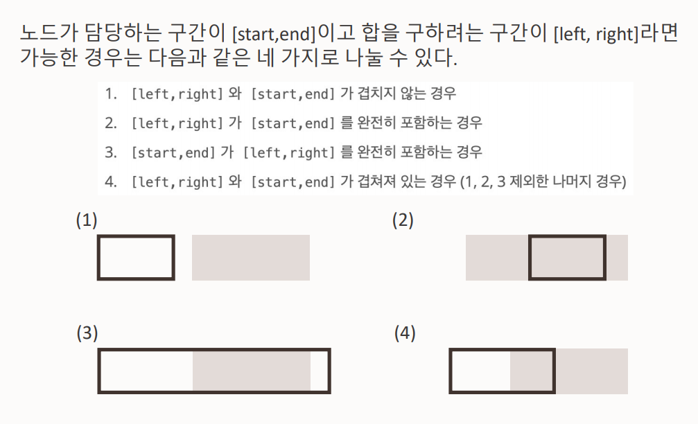 (2): [left, right]가 [start, end]를 완전히 포함하므로 더이상 탐색할 필요 x => tree[node] 반환