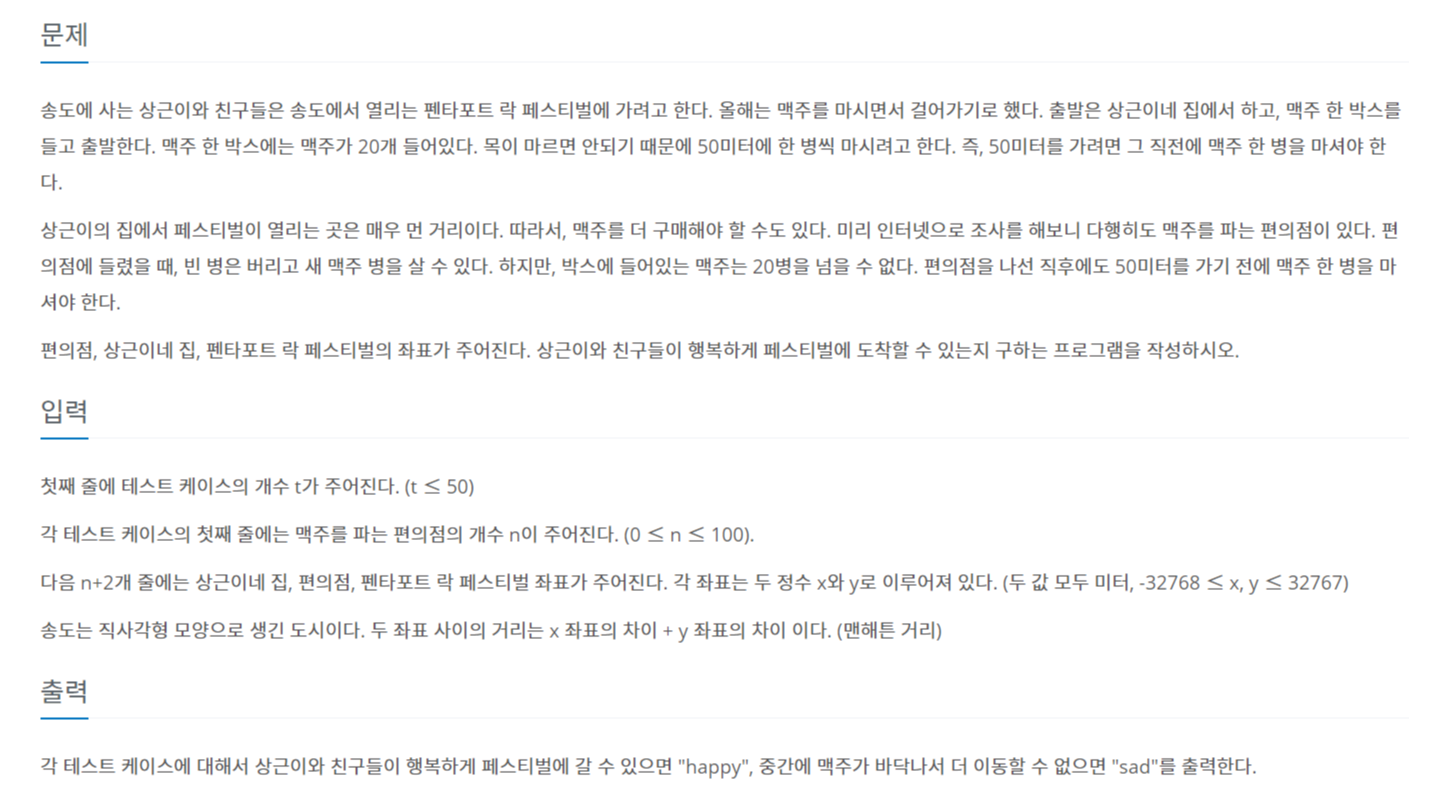 송도에 사는 상근이와 친구들은 송도에서 열리는 펜타포트 락 페스티벌에 가려고 한다. 올해는 맥주를 마시면서 걸어가기로 했다. 출발은 상근이네 집에서 하고, 맥주 한 박스를 들고 출발한다.