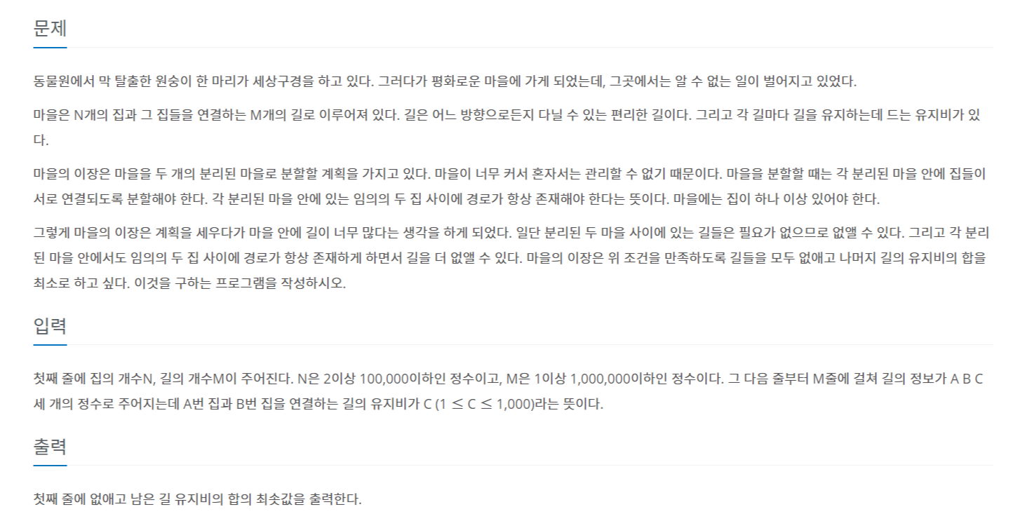 첫째 줄에 집의 개수N, 길의 개수M이 주어진다. N은 2이상 100,000이하인 정수이고, M은 1이상 1,000,000이하인 정수이다. 그 다음 줄부터 M줄에 걸쳐 길의 정보가 A B C 세 개의 정수로 주어지는데 A번 집